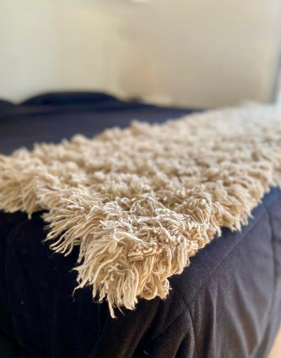 Tejido a mano con orillo combinando los colores beige y crudo
